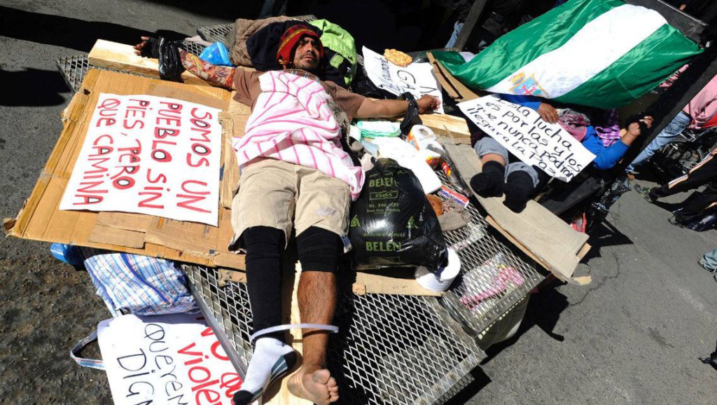 Decenas de discapacitados permanecen durante tres días en las cuatro vías de acceso a la plaza principal de La Paz como medida de presión para ser recibidos por el presidente Evo Morales. “Estaremos aquí hasta las últimas consecuencias. Queremos vivir con dignidad”, afirmó Diego Cayo, líder de los manifestantes, a tiempo de rechazar una última invitación del gobierno a dialogar, pues esa convocatoria no contempla la discusión sobre el monto del subsidio.