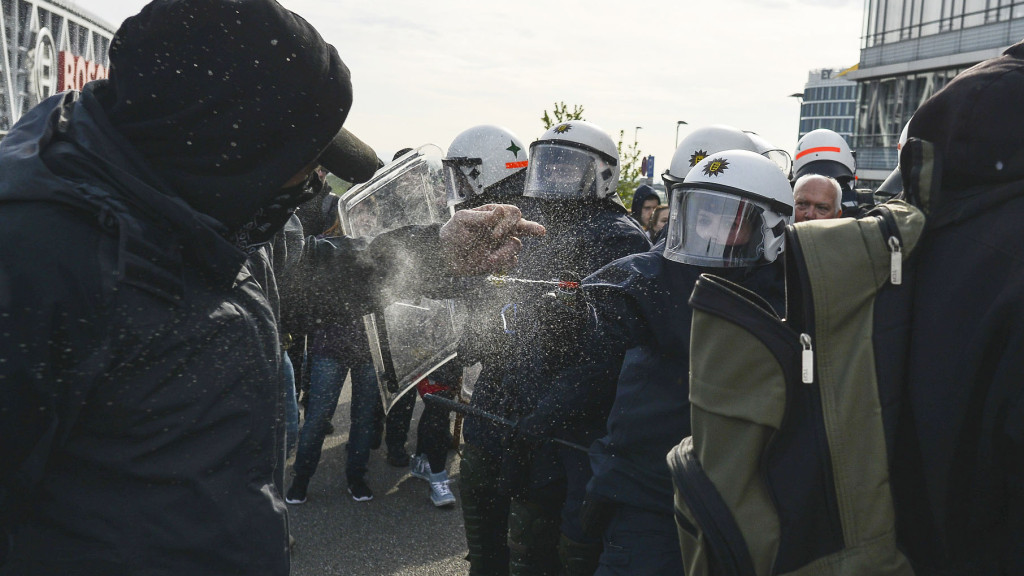 Algunos manifestantes quemaron neumáticos y lanzaron petardos contra los policías y los periodistas, a lo que la policía respondió con gas pimienta y gases lacrimógenos, y más tarde, se produjeron enfrentamientos entre militantes de izquierda y miembros del AFD. En total, se desplegaron más de mil policías antidisturbios para controlar las zonas cercanas al palacio de congresos, rodeado bajo fuertes medidas de seguridad.