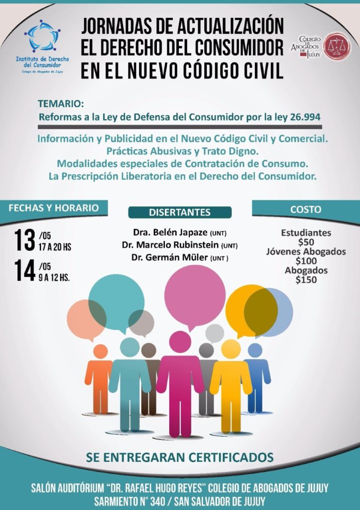 El viernes 13 y sábado 14 de mayo se desarrollará en el Salón Auditorium “Dr. Rafael Hugo Reyes” del Colegio de Abogados de Jujuy la Jornada de Actualización de Derecho al Consumidor organizado por el Instituto de Derecho del Consumidor.