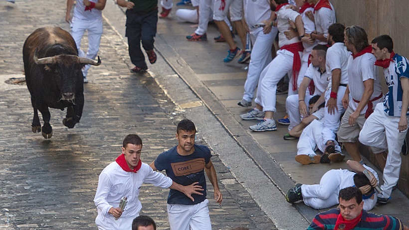 Durante las fiestas de San Fermín, en honor al santo patrón de Navarra, cada mañana a las 08:00 (hora local), cientos de personas se lanzan junto a los toros en una carrera en la que los más temerarios corren cerca de las astas de los toros, intentando evitar ser corneados.
