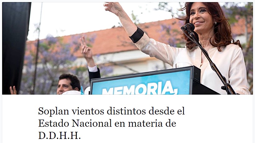 La expresidenta Cristina Fernández de Kirchner advirtió el miércoles que “soplan vientos distintos desde el Estado Nacional en materia de derechos humanos” y denunció que existe un “desmantelamiento de organismos estatales” y una “ralentización de los juicios”, además de “disminución de recursos”.