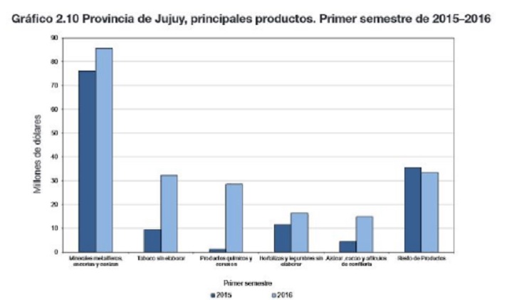 En el primer semestre de 2016, Jujuy registró una suba en sus exportaciones del 52,9 por ciento, respecto de igual período de 2015, alcanzando el valor de 211 millones de dólares.