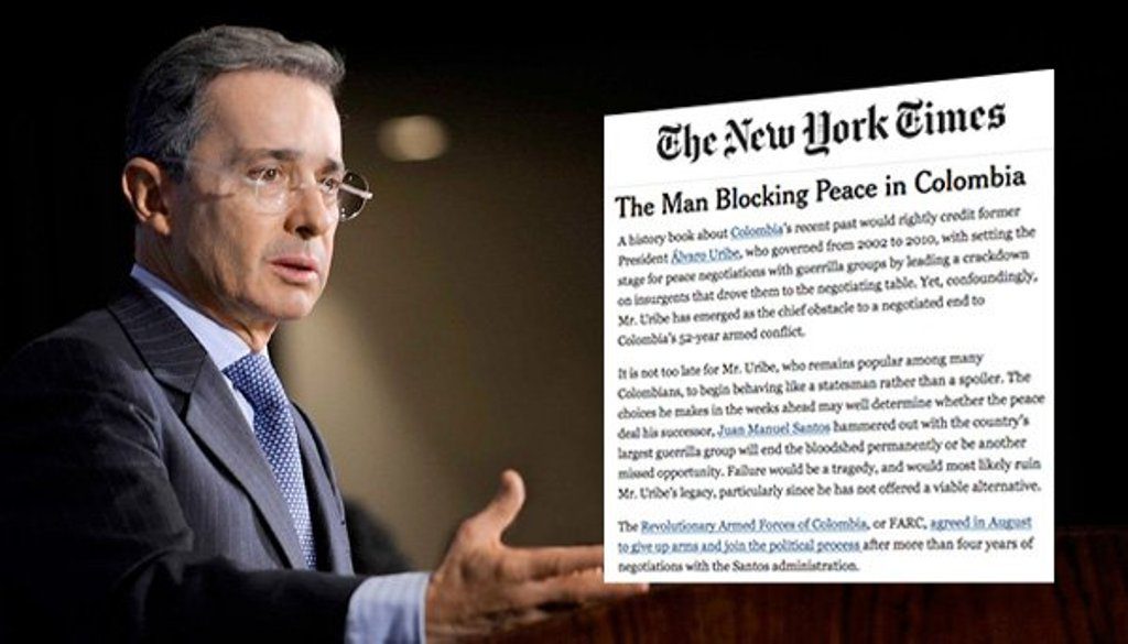 El titular del editorial del rotativo estadounidense era “El hombre que bloquea la paz en Colombia” e instaba a Uribe a empezar a comportarse como un “hombre de Estado” y a tener un “papel constructivo” para no bloquear la paz.