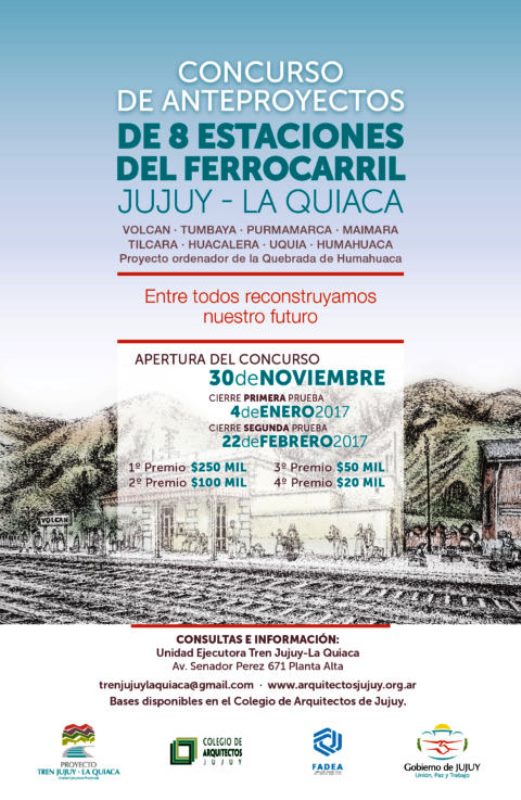 El Colegio de Arquitectos de Jujuy, en conjunto con la Unidad Ejecutora Tren Jujuy La Quiaca, anuncian el lanzamiento del Concurso Provincial destinado a la refuncionalización de 8 estaciones ferroviarias en las localidades de Volcán, Tumbaya, Purmamarca, Maimará, Tilcara, Huacalera, Uquía y Humahuaca. Este Concurso forma parte de las acciones de planificación promovidas por el Gobierno de la Provincia de Jujuy en su determinación de avanzar en el desarrollo e implementación de un sistema de movilidad integral de transporte. Dicho sistema, busca facilitar la conectividad en la región tanto para los argentinos como para el turismo receptivo, comenzando en esta primera etapa en el tramo Volcán-Humahuaca con un Tren Turístico para la Quebrada de Humahuaca para luego continuar con el transporte de pasajeros y de carga.