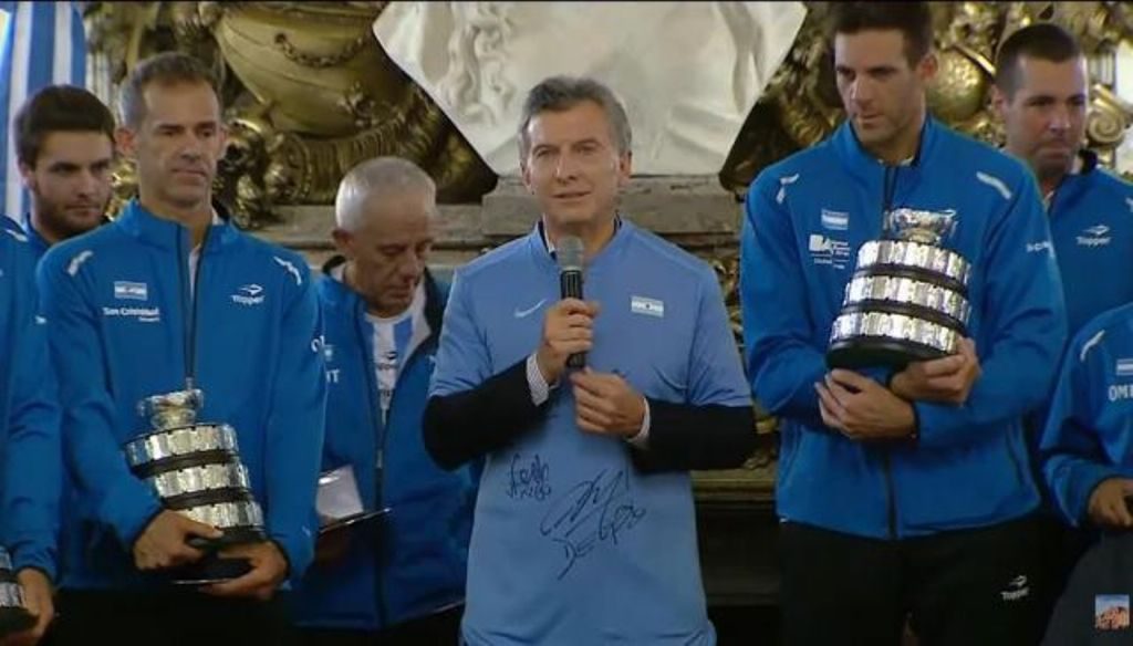 “Es un momento tan especial para el tenis argentino, para el deporte argentino y siento que aun a aquellos que ni les gusta el tenis ni les gusta el deporte se sienten conmovidos con lo que hemos vivido el fin de semana”, dijo Macri a los integrantes del equipo argentino luego de entregarles plaquetas en reconocimiento por la obtención de la copa, en un acto que se realizó en el Salón Blanco.