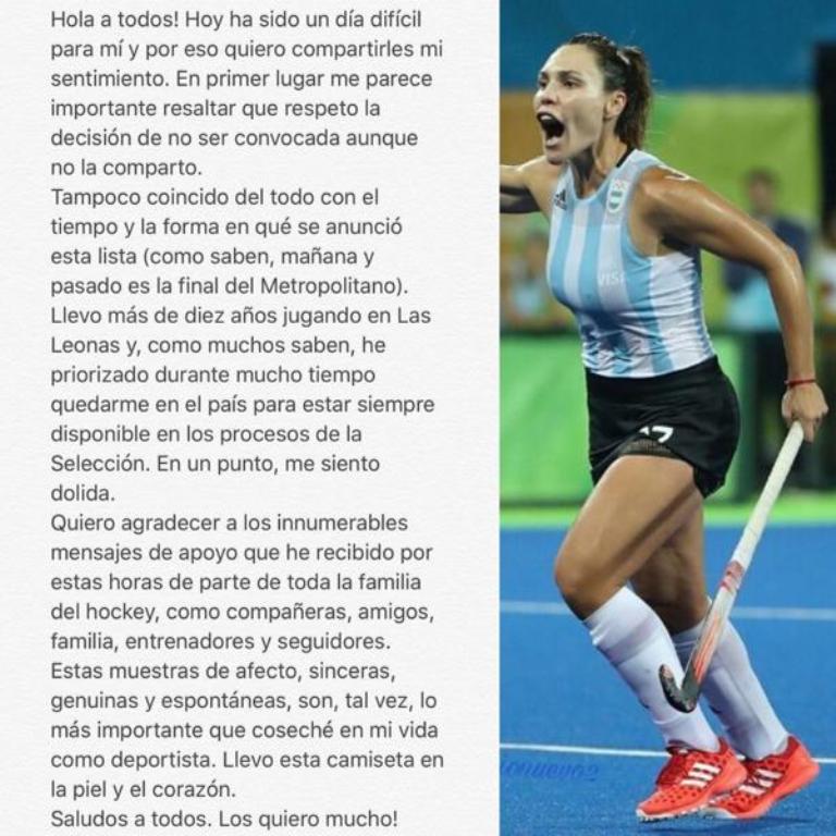 Tampoco coincido del todo con el tiempo y la forma en que se anunció esta lista (como saben, mañana y pasado es la final del Metropolitano). Llevo más de diez años jugando en Las Leonas y, como muchos saben, he priorizado durante mucho tiempo quedarme en el país para estar siempre disponible en los procesos de la Selección. En un punto, me siento dolida”.
