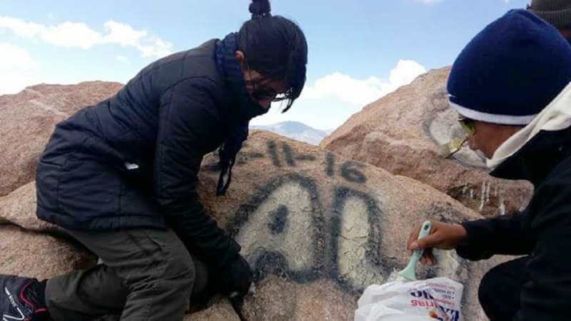 De manera conjunta, un equipo del Ministerio de Ambiente encabezó el proceso de remediación de una roca del cerro Chañi que había sido afectada de manera negligente con un grafiti. La mujer involucrada (fue noticia en las redes sociales, donde corrió rápidamente la información que la mujer había pintado con aerosoles las rocas del mítico cerro jujeño) corrigió su conducta y reconoció el valor sagrado del sitio para las comunidades que habitan zonas cercanas y que se habían sentido agraviadas.