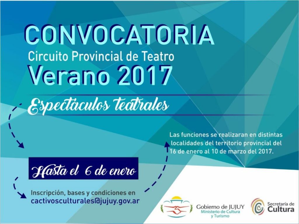 La Secretaría de Cultura de la Provincia convoca a grupos, elencos y/o espectáculos teatrales, a inscribirse hasta el 6 de enero de 2017, para formar parte del Programa “Circuito Provincial de Teatro Verano 2017″, que prevé la realización de funciones de obras jujeñas en las distintas localidades de la provincia desde del 16 de enero al 10 de marzo de 2017.