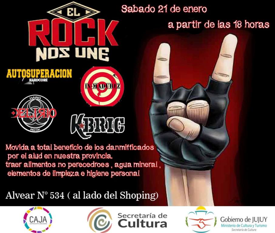 La Secretaría de Cultura a través del Centro de Arte Joven Andino ( C.A.J.A), invita al público en general a participar del recital solidario denominado: “El Rock nos Une”, a realizarse el próximo sábado 21 a partir de las 18 horas, en dicho centro cultural, ubicado en Alvear 435, a total beneficio de las familias de Bárcena, Volcán y Tumbaya.