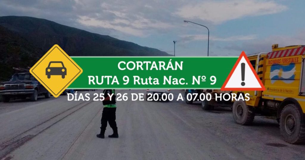 Por trabajos considerados urgentes, a realizarse por parte de las Direcciones de Vialidad Nacional y Provincial, el Comité Operacional de Emergencia (COE) dispuso el corte sobre la Ruta Nacional N° 9 los días miércoles 25 y jueves 26 de enero, entre las 20.00 a 07.00 horas.