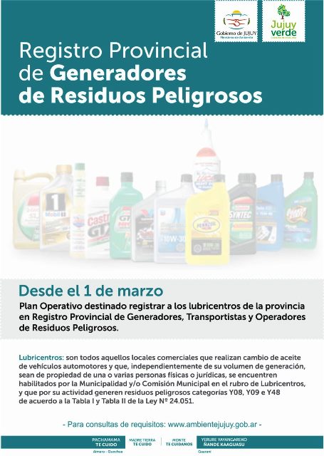 Con el propósito de dar cumplimiento a la ley Nº 5011 que reglamenta el Dec. 6002/06, la Secretaría de Calidad Ambiental comunica a los Municipios, Comisiones Municipales y Lubricentros de la provincia que, a partir del 1 de marzo se dará inicio al Plan Operativo destinado registrar a los lubricentros de la provincia en Registro Provincial de Generadores, Transportistas y Operadores de Residuos Peligrosos.