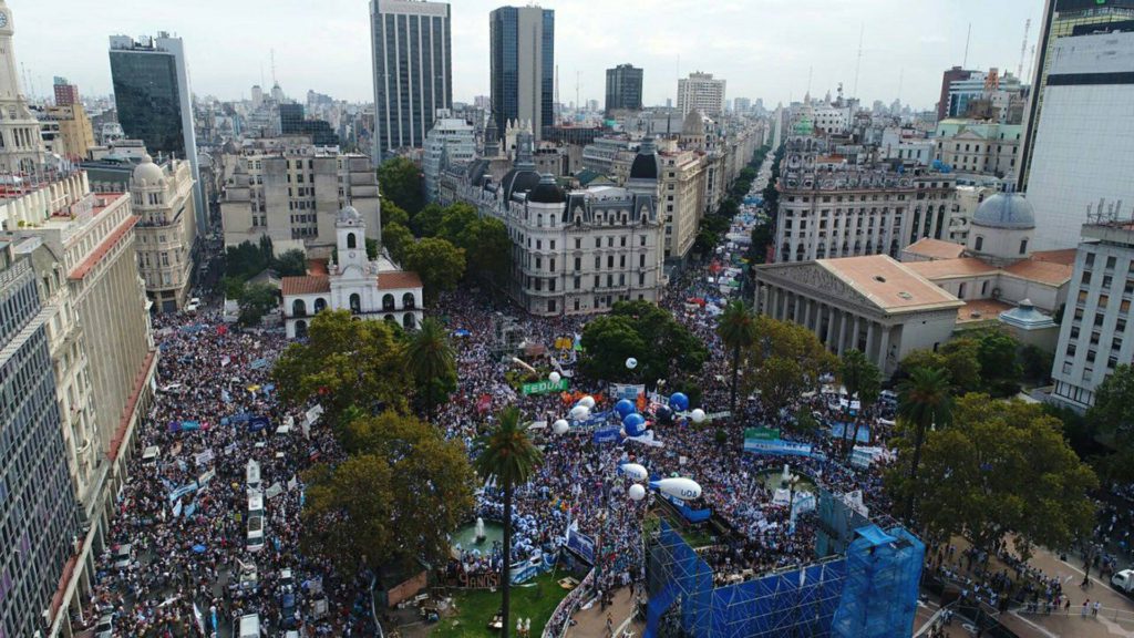 Las columnas de maestros provenientes de Cuyo y del Nordeste (NEA) y Noroeste (NOA) del país junto con docentes de las cinco confederaciones convocantes de la Marcha Federal Educativa, marcharon hacia la histórica Plaza de Mayo tras concentrarse frente al Congreso Nacional y convergieron con otros manifestantes en el acto central que tuvo lugar a partir de las 15.