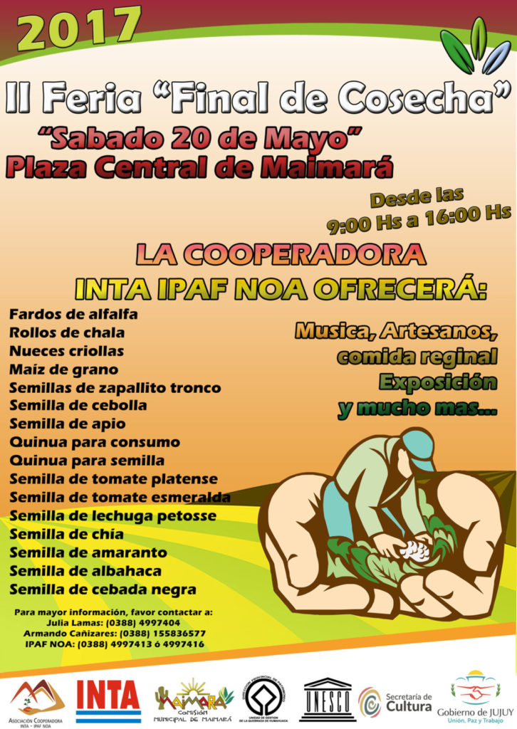 Desde la Secretaría de Cultura convocan a productores y artesanos de Quebrada y Puna para participar en la Segunda Feria “Final de cosecha” y el intercambio y exposición de productos locales, a concretarse el sábado 20 de mayo en la Plaza Central de Maimará, Jujuy, de 9 a 16.