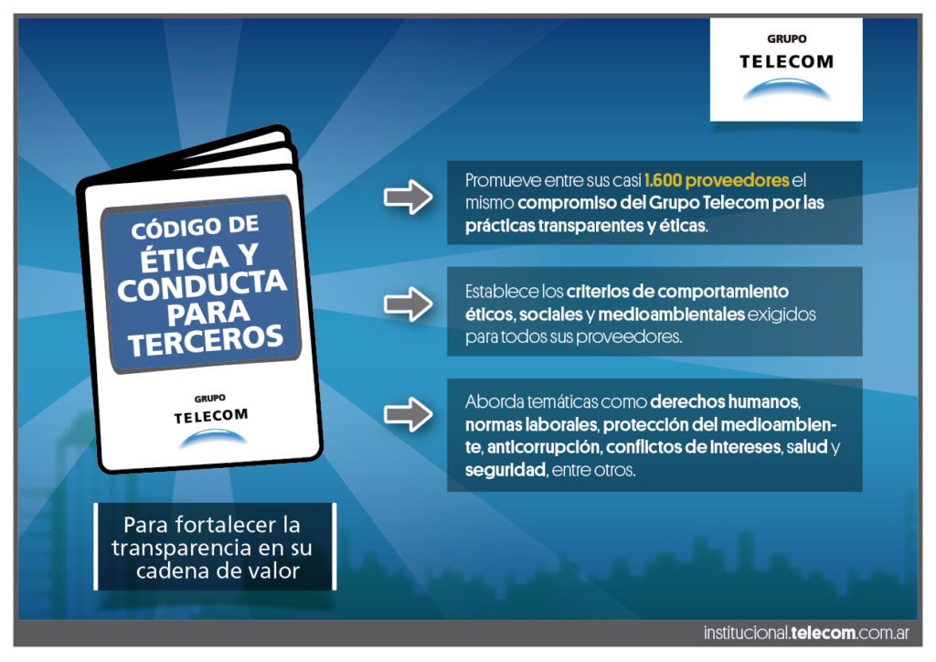 El “Código de Ética y Conducta para Terceros” se suma al “Código de Ética y Conducta” y a las “Políticas de Conflicto de Intereses, Antifraude y Anticorrupción”, documentos corporativos que guían las operaciones de todo el Grupo Telecom. Con estos documentos, la compañía reafirma el compromiso asumido en 2004 al adherir al Pacto Global de Naciones Unidas y da cumplimiento a sus 10 principios en materia de derechos humanos, normas laborales, protección de medio ambiente y lucha contra la corrupción.
