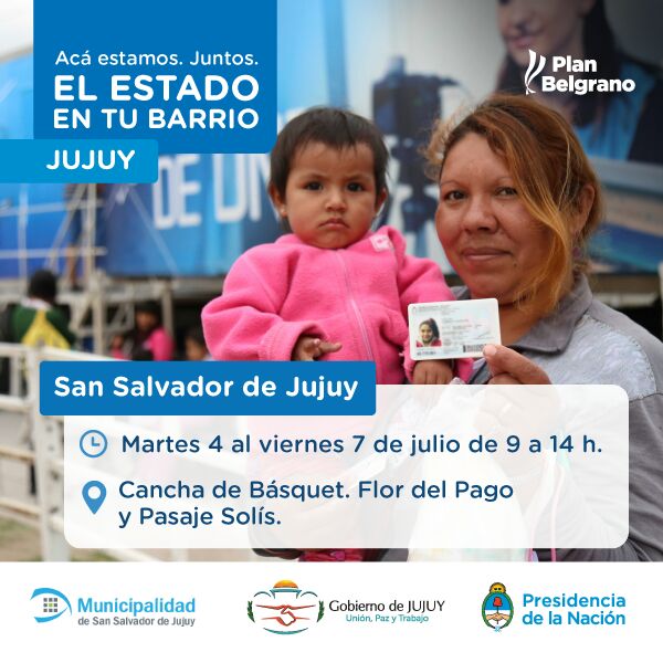 La próxima semana, el programa social impulsado por Nación “El Estado En Tu Barrio” se instalará, desde el martes 4 al 7 de julio, en la Cancha de Básquet entre las calles Flor del Pago y Pasaje Solís del Barrio Prensa.