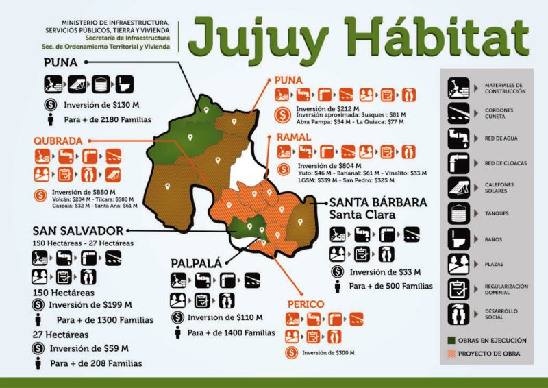 Las obras que integran el programa denominado #JujuyHábitat que encaran los equipos técnicos de la secretaría de Infraestructura consisten específicamente en la dotación de infraestructura básica, como agua potable, desagües pluviales, asfalto, cordón cuneta, veredas, iluminación segura y eficiente, acueductos, sistema cloacal y arborizaciones. Todas estas obras son acompañadas con un trabajo de carácter social a través de la Secretaría de Ordenamiento Territorial y Vivienda quienes son responsables de relevar datos de familias y asistir a los vecinos antes, durante y después de la ejecución del programa. Garantizando así no solo el derecho a un hábitat digno, sino también el acompañamiento del estado, mediante profesionales en situaciones de alta vulnerabilidad.
