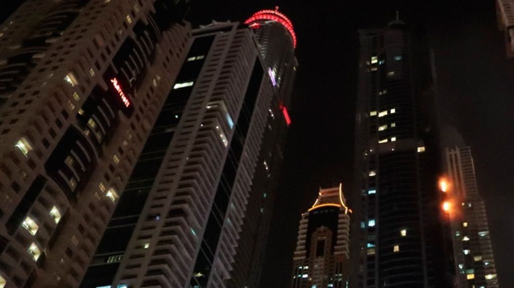 Se trata de la torre The Torch , un rascacielos de 86 pisos situado en una marina del Golfo Pérsico. Bomberos combaten las llamas que consumen la planta superior del edificio, de más de 350 metros de altura.