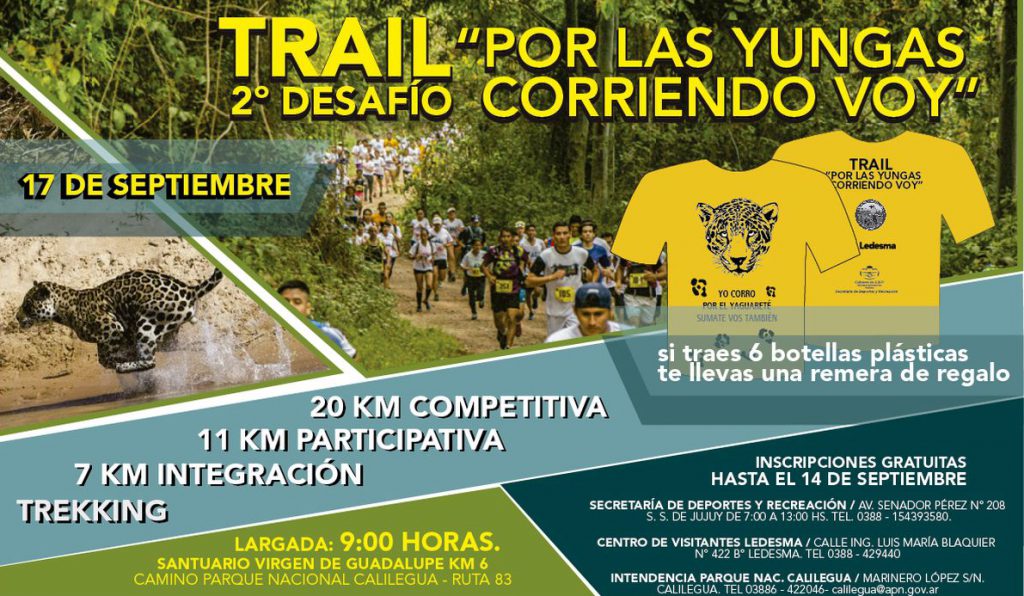 La Intendencia de Parque Nacional Calilegua, la Secretaría de Deportes y Recreación de Jujuy y la empresa Ledesma, invitan a participar del Segundo Trail Por las Yungas Corriendo Voy, a realizarse gratuitamente el 17 de septiembre a las 9 h. desde el Santuario de la Virgen de Guadalupe en Calilegua.