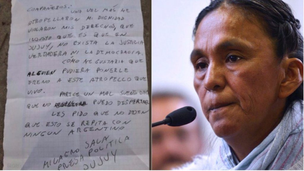 “Cómo me gustaría que alguien (sic) pudiera ponerle freno a este atropello que vivo. Parece un mal sueño del que no puedo despertar. Les pido que no dejen que esto se repita con ningún argentino”, expresó antes de firmar “Milagro Sala. Presa política. Jujuy”.