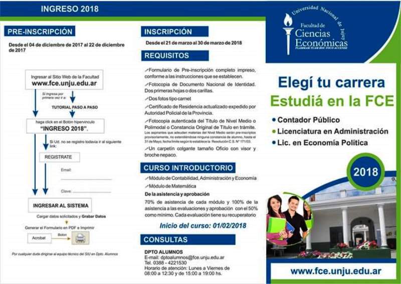 Para registrar la preinscripción, los interesados deben acceder al sitio web de la Facultad, www.fce.unju.edu.ar, y registrarse con todos los datos solicitados, y luego generar el formulario correspondiente en PDF e imprimirlo. Dicha documentación deberá ser presentada, al momento de la inscripción anual, junto a fotocopia de DNI; dos fotos tipo carnet; Certificado de Residencia actualizado expedido por autoridad policial provincial; fotocopia autenticada del Título de Nivel Medio o Constancia original de Título en trámite; y un carpetín colgante tamaño oficio con visor y broche nepaco.