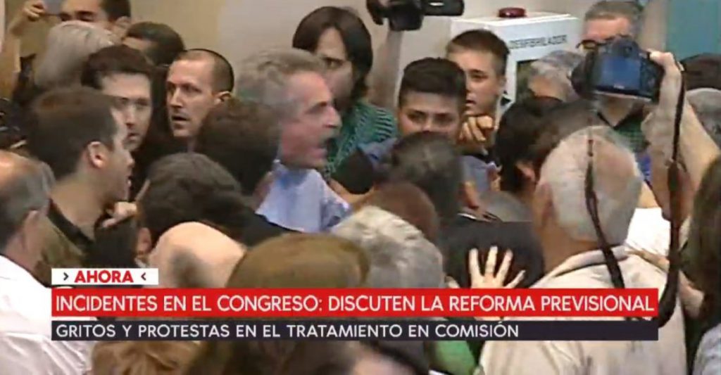 Un grupo de jubilados y sindicalistas que rechazaron la reforma al advertir que significará un perjuicio para sus bolsillos asistieron a la reunión e insultaron al ministro de Hacienda, Nicolás Dujovne, y de Trabajo, Jorge Triaca.