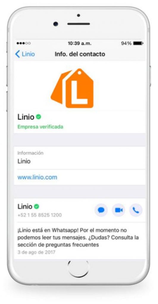 A principios de noviembre se inició la prueba piloto, en la que Linio se registró como Empresa Verificada para WhatsApp Business, en esta etapa sólo se mandan notificaciones de pedidos a los usuarios, pero próximamente se habilitará el canal a una comunicación bilateral donde el usuario podrá tener una conversación con la tienda en línea, realizar compras, aclarar sus dudas y muchas otras funcionalidades.