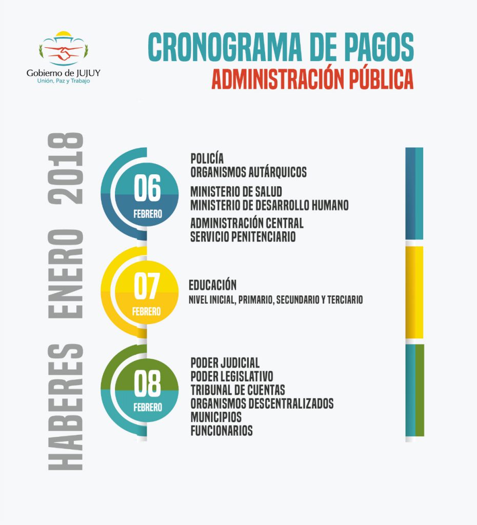 Desde Tesorería de la Provincia se realizó el anuncio del cronograma de pagos de haberes netos para los empleados de la administración pública provincial y municipal, correspondiente a enero 2018, el que se concretará de la siguiente manera: