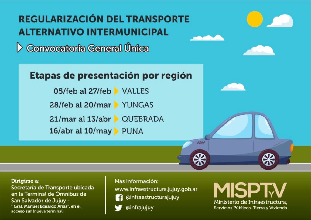 El secretario Agustín Macedo, explicó que “estamos convocando a todos los actores por región para poder trabajar con ellos de manera ordenada; comenzamos con la zona Valles, para seguir con Yungas, Quebrada y Puna”. “Esta es la primera de tres etapas: la convocatoria a quienes hayan prestado este servicio en las rutas provinciales desde antes de 2015, año tras el que realizamos el censo con el que contamos. Deben presentarse en la Secretaría de Transporte, con la documentación personal y del vehículo, uno por persona, fijando domicilio legal y electrónico para que dentro de este proceso podamos trabajar juntos”, detalló el funcionario, y sumó que “toda la Información se encuentra en la página del Ministerio de Infraestructura, infraestructura.jujuy.gob.ar, donde se puede descargar el formulario de inscripción”.