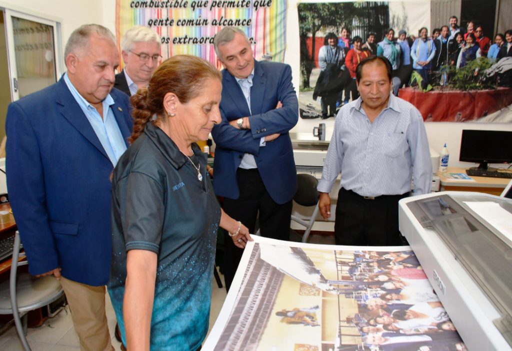 El gobernador Gerardo Morales junto al titular del Instituto Nacional de Asociativismo y Economía Social (INAES), Marcelo Collomb, y el ministro de Trabajo y Empleo, Jorge Cabana Fusz, entregaron equipamiento e insumos a la cooperativa textil Kalpa Sariri de Alto Comedero.
