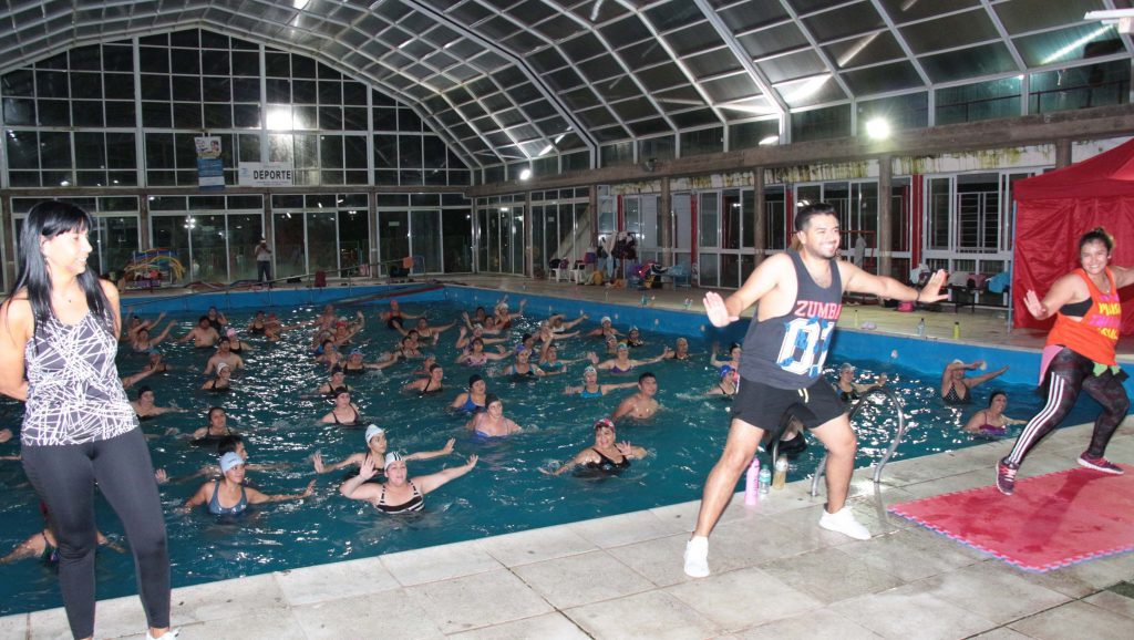 Diferentes ritmos generan una fiesta en el natatorio municipal Guillermo Poma. Bailar, bañarse en la piscina y quemar calorías es una de las mejores opciones que ofrece la dirección de Deporte de la Municipalidad de San Salvador de Jujuy los lunes, miércoles y viernes de 21 a 22 horas. Las clases se dictan lunes, miércoles y viernes de 21 a 22 horas y tienen un costo mínimo de $30.