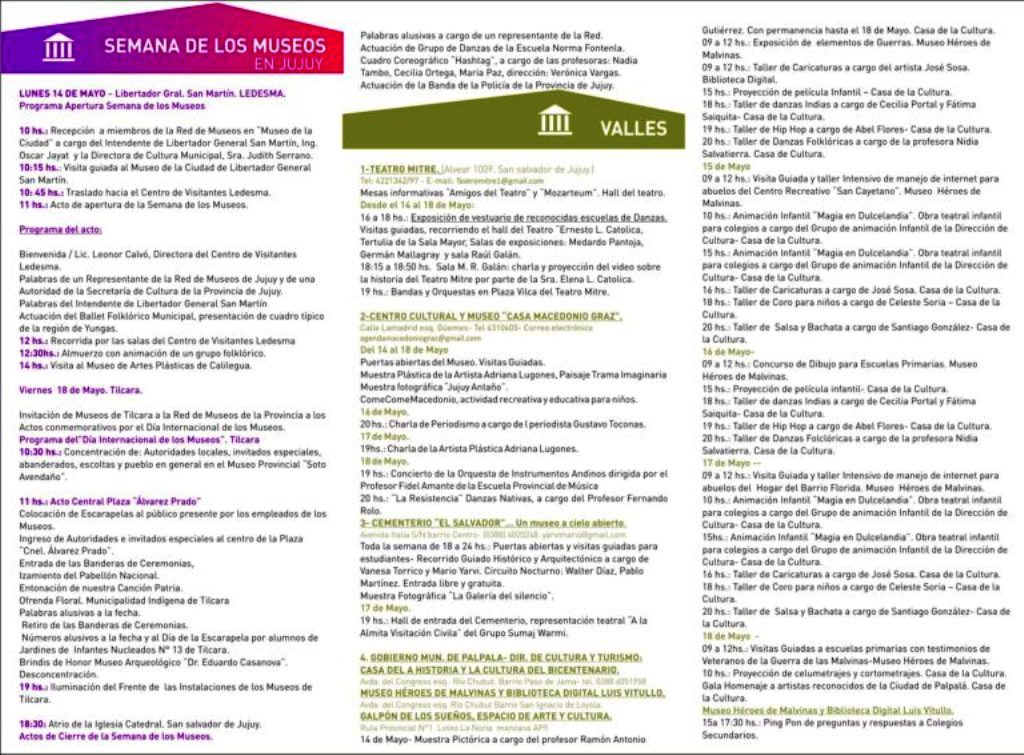El Ministerio de Cultura y Turismo recordó que se está llevando adelante la Semana de los Museos y que se extenderá hasta este viernes, 18 de mayo. El programa ofrece visitas guiadas a los distintos museos, espectáculos teatrales, talleres y diversas actividades en las regiones de Valles, Yungas, Quebrada y Puna.