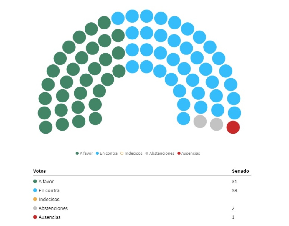 La iniciativa que logró media sanción de la Cámara de Diputados el 13 de junio fue rechazada y no puede volver a ser tratada por un año. La votación terminó con 38 votos negativos contra 31 positivos y dos abstenciones.