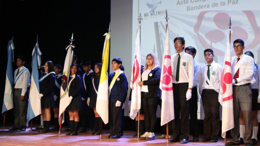 Bajo la premisa de promover el bien común y vivir positivamente, la Escuela Municipal Nº 1 Maestra Marina Vilte y la Coordinación de Embajada de Paz de la Provincia de Jujuy, a través de un acto de Padrinazgo, entregaron Banderas de la Paz a 16 instituciones educativas.