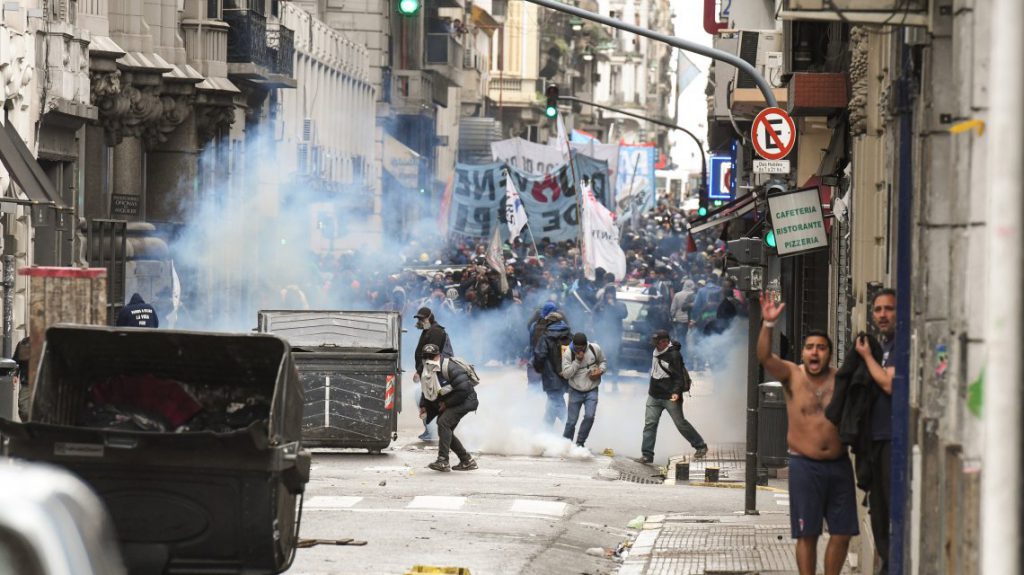 Efectivos de la Guardia de Infantería de la Policía arrojaron este miércoles por la tarde gases lacrimógenos y balas de goma contra manifestantes que los atacaban a pedradas en el marco de la protesta contra el Presupuesto 2019 que tiene lugar en las inmediaciones del Congreso.