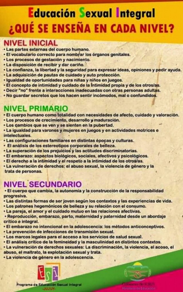 Los contenidos que se brindan se ajustan a la normativa, dijo y subrayó que los ejes de ESI son el cuidado del cuerpo, el cuidado de los afectos, la prevención de los embarazos no intencionales y el respeto a la diversidad. “Es información que los chicos de todas las edades, desde jardín hasta el nivel superior, necesitan para ejercer sus derechos, para hacerse respetar como personas”, advirtió para remarcar la importancia de la información para proteger a los niños de abusos sexuales, a partir de conocer cuáles son los límites y cuáles los actos que dañan a las personas.