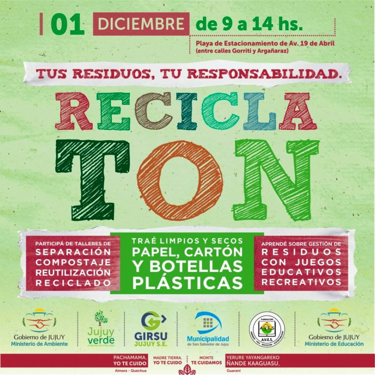 El sábado 1 de diciembre, desde las 9 y hasta las 14, se llevará a cabo otra edición de la Reciclaton, la maratón de reciclaje organizada por el Ministerio de Ambiente, el Ministerio de Educación, la Municipalidad de San Salvador de Jujuy, la empresa GIRSU S.E., y la Fundación Ambiente, Vida, Educación, Sustentabilidad (AVES).