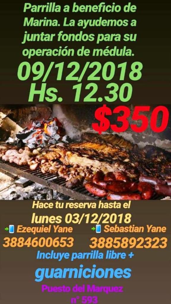 Sus hijos decidieron realizar una parrillada solidaria el domingo 9 de diciembre para ayudar a sus padres. Se realizará en Puesto del Marquéz 593 de nuestra ciudad el día 9, pero recibirán pedidos hasta el próximo lunes 3. Incluye parrilla libre y guarniciones, con un costo de $350. Los interesados pueden realizar reservas o colaborar comunicándose a los teléfonos 3884600653 (Ezequiel) o 3885892323 (Sebastián).