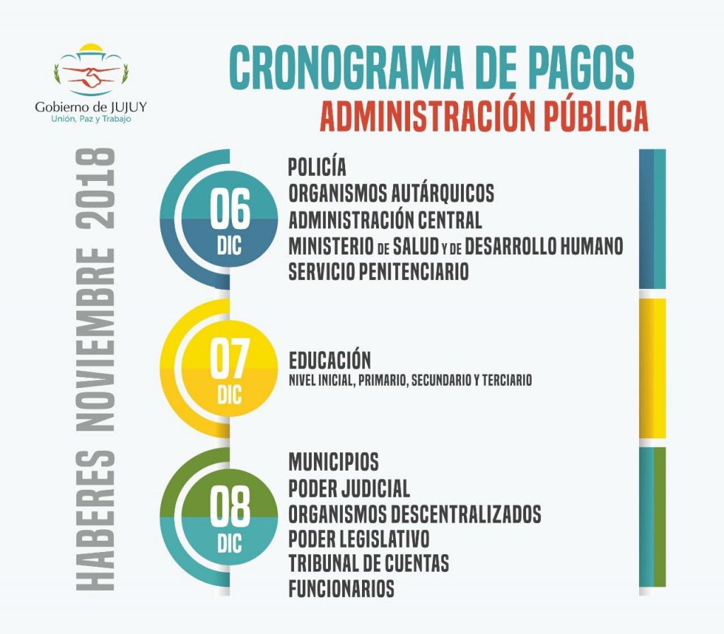 Tesorería de la Provincia anunció el cronograma de pagos de haberes netos para los empleados de la administración pública provincial y municipal por el período noviembre 2018, que se concretará de la siguiente manera: