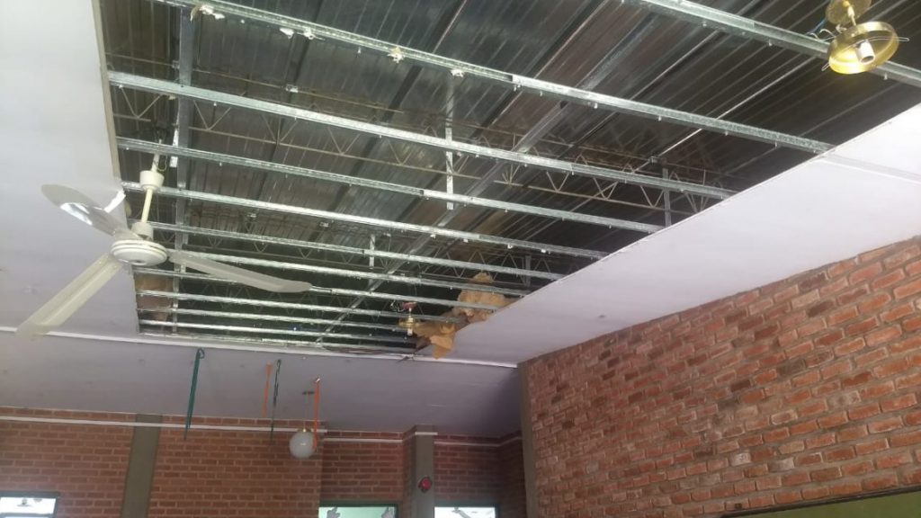 Personal de la Dirección de Mantenimiento de Edificios Escolares repuso la cubierta desprendida en la planta alta por efecto del fuerte viento acompañado de intensa lluvia, descargas eléctricas y caída de granizo que se registraron en esa fecha.