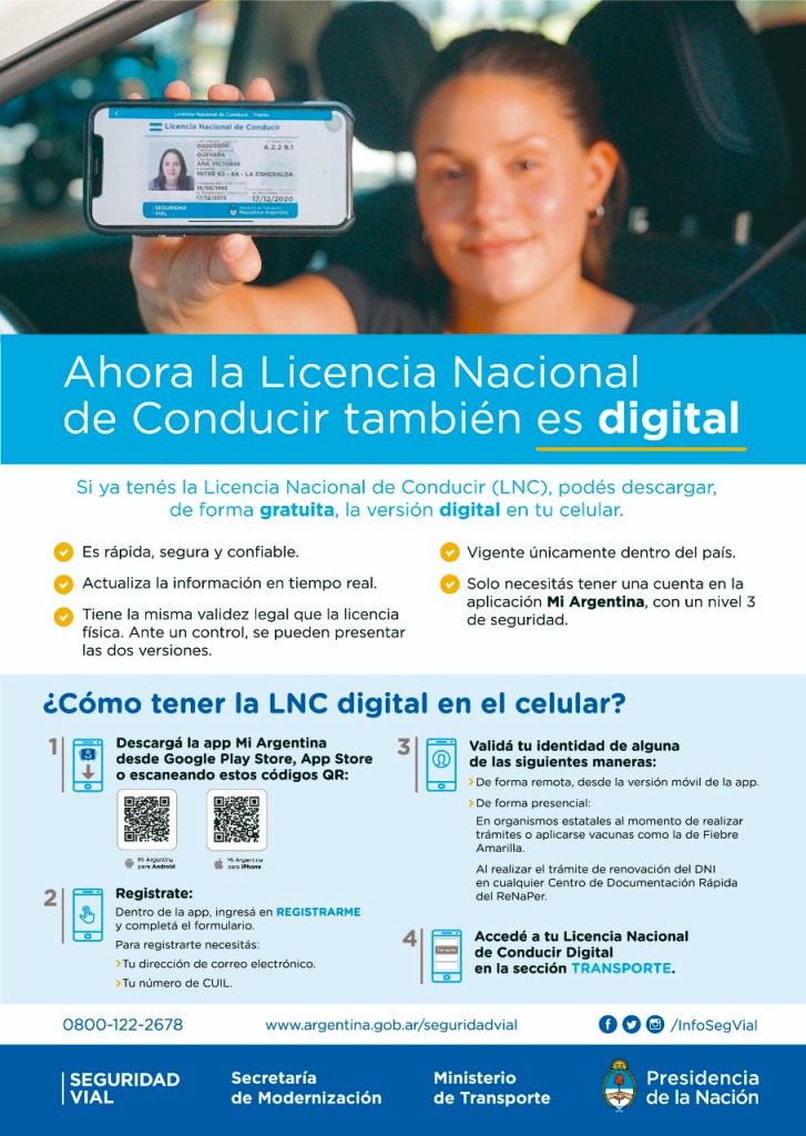 Los conductores deberán descargar la App “MiArgentina” en sus celulares, crear una cuenta con una dirección de correo electrónico y CUIL. Asimismo, será necesario validar su identidad agregando una foto del frente y dorso del DNI más una referencia biométrica. Desde la misma aplicación, los usuarios podrán descargar su Licencia Nacional de Conducir y utilizarla en los controles viales sin inconvenientes.