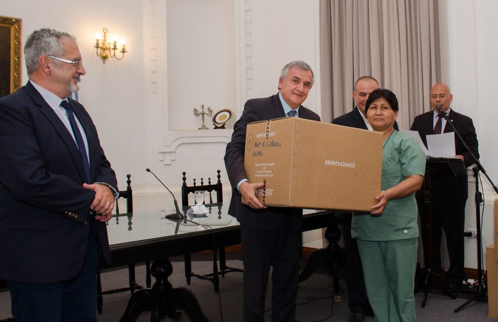 El gobernador Gerardo Morales presidió en el Salón Blanco el acto de entrega de cheques a los municipios de Palpalá por un monto de 1.289.182 pesos y para San Pedro por un valor de 2.289.250 pesos, correspondientes al Programa Municipios Saludables y un videocolonoscopio de última generación. Esos beneficios se concretaron con fondos de Nación a partir de la CUS-Proteger. También se entregaron 15 computadoras para el Departamento Provincial de Inmunizaciones. Estas acciones forman parte de la ejecución en todo el territorio del Plan Estratégico de Salud.