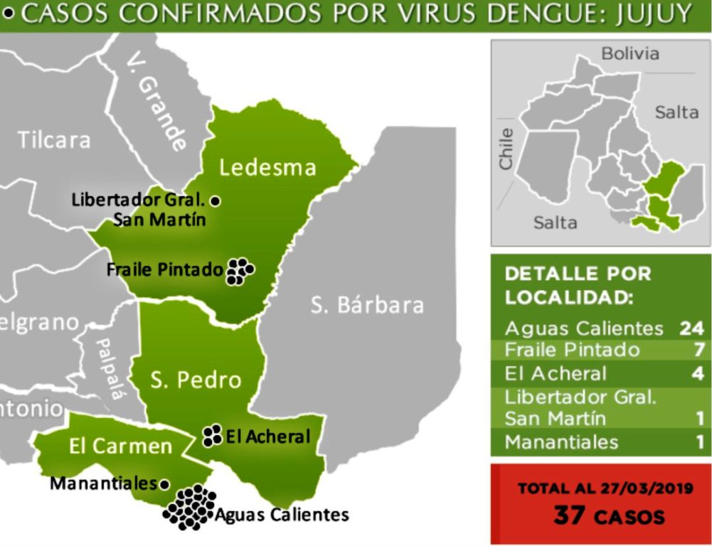 “Al dia de la fecha hemos confirmado 37 casos positivos para dengue que se encuentran distribuidos; 24 en Aguas Calientes, 7 en Fraile Pintado, 4 en El Acheral, 1 en Libertador General San Martín y 1 en Manantiales”, sostuvo la Subdirectora de Epidemiología Laura Paredi al brindar el informe de situación actual en la Provincia de Jujuy.