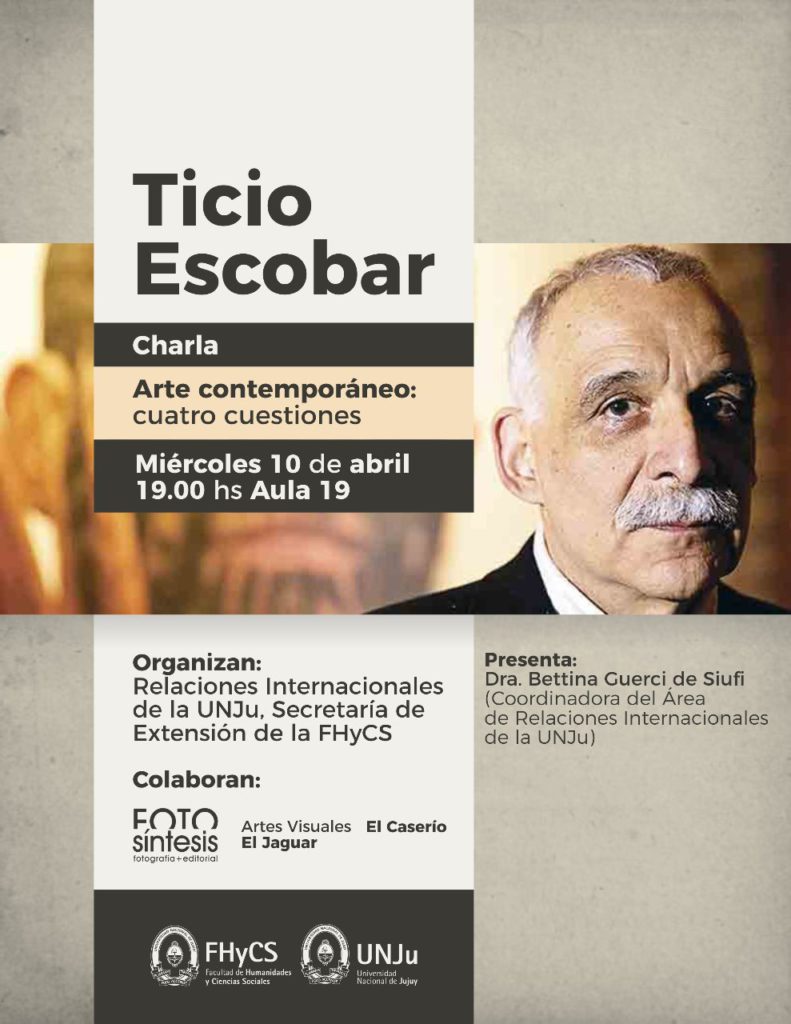 El Área de Relaciones Internacionales de la Universidad Nacional de Jujuy (UNJu) y la Secretaría de Extensión de la Facultad de Humanidades y Ciencias Sociales (FHyCS), invitó a la comunidad en general a participar de la charla “Arte Contemporáneo: cuatro cuestiones”, que estará a cargo de Ticio Escobar. La misma se realizará el próximo 10 de abril, a horas 19, en el aula 19 de la FHyCS, calle Otero 262, San Salvador de Jujuy.