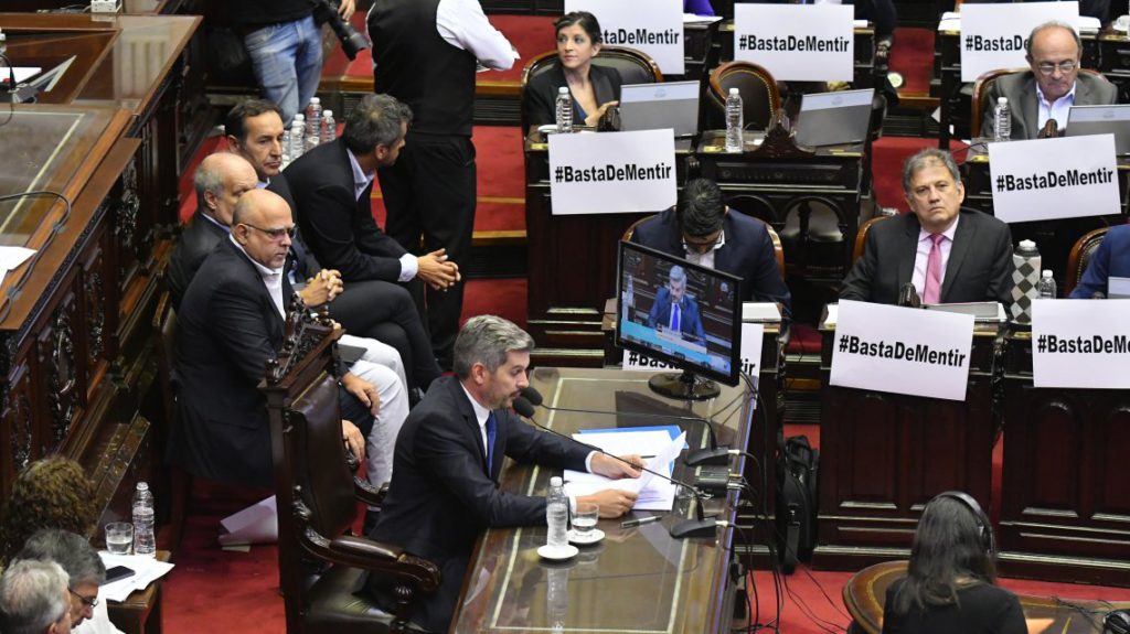 Y al finalizar la primera parte de su exposición antes de irse a un cuarto intermedio, cerró con otra chicana: “Vi ese cartel y me ilusioné. Dije ‘autocrítica del kirchnerismo’ pero no, claro”, en referencia a unos carteles que sostenían los diputados con la leyenda “#BastadeMentir”.