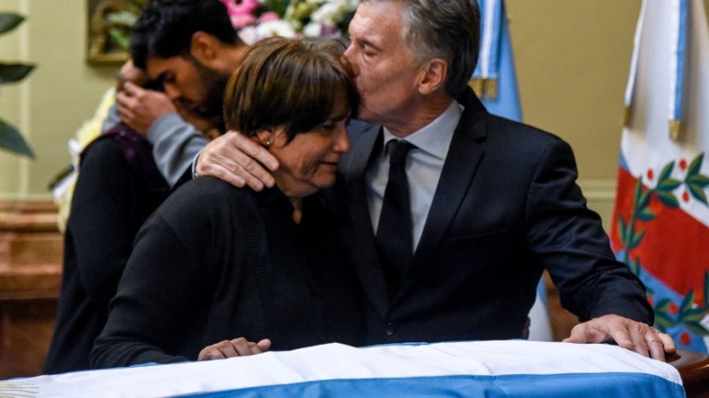 El jefe de Estado acompañó a la viuda hasta el cajón mientras la abrazaba. Detrás estaban las banderas de Argentina, de la de La Rioja y la de la UCR. “Los quiero ver presos”, le dijo Susana Castro. A lo que el mandatario respondió: “La Justicia y las fuerzas de seguridad hicieron su trabajo y ya están todos detenidos”.