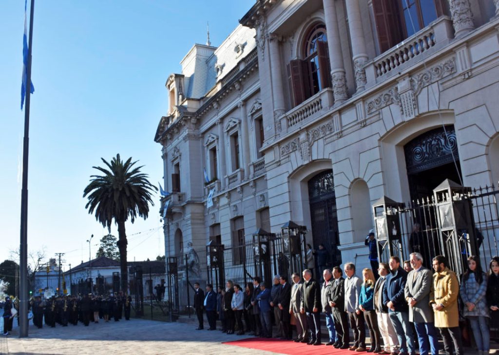 El izamiento de la Bandera Nacional, estuvo a cargo del mandatario provincial; el ministro de Gobierno y Justicia, Agustín Perassi y empleados del Palacio gubernamental; mientras que el izamiento de la Bandera Nacional de la Libertad Civil, fue realizado por el intendente capitalino, Raúl Jorge; el presidente del Concejo deliberante, Lisandro Aguiar y empleados de Casa de Gobierno.