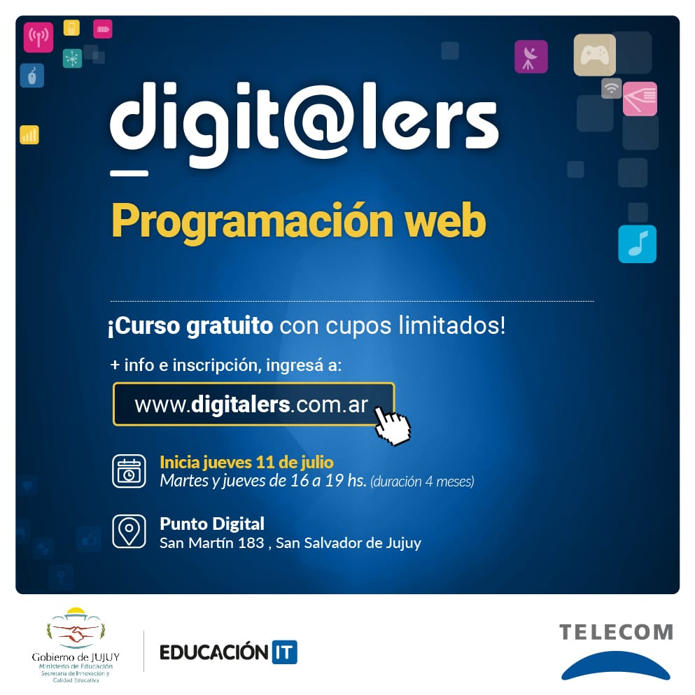 Con una propuesta que convoca a los jóvenes jujeños a conectarse con el mundo digital y aprender sobre tecnología, Telecom iniciará en julio su programa digit@lers. En alianza con el Gobierno provincial, y a través de la Secretaría de Innovación y Calidad Educativa del Ministerio de Educación, este curso de cuatro meses de duración se estará desarrollando los días Martes y Jueves de 16 a 19 hs en el Punto Digital, ubicado en la calle San Martín 183 de la ciudad de Jujuy.