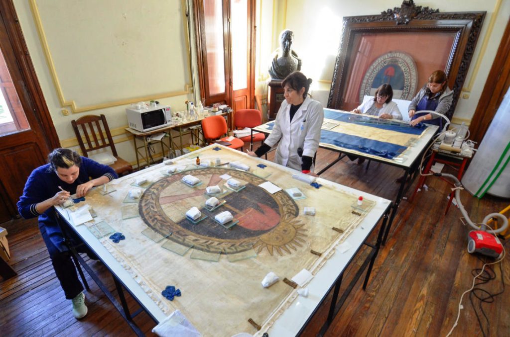 En el marco de los trabajos de restauración y puesta en valor de la Bandera Nacional de la Libertad Civil, el equipo de restauradoras, compuesto por María Sol Barcalde, Ivana Rigacci, María Dora Lasalandra Aguirre, y la directora Provincial de Patrimonio, Valentina Millón, detallaron los trabajos actuales que se están realizando sobre el invaluable patrimonio histórico nacional.