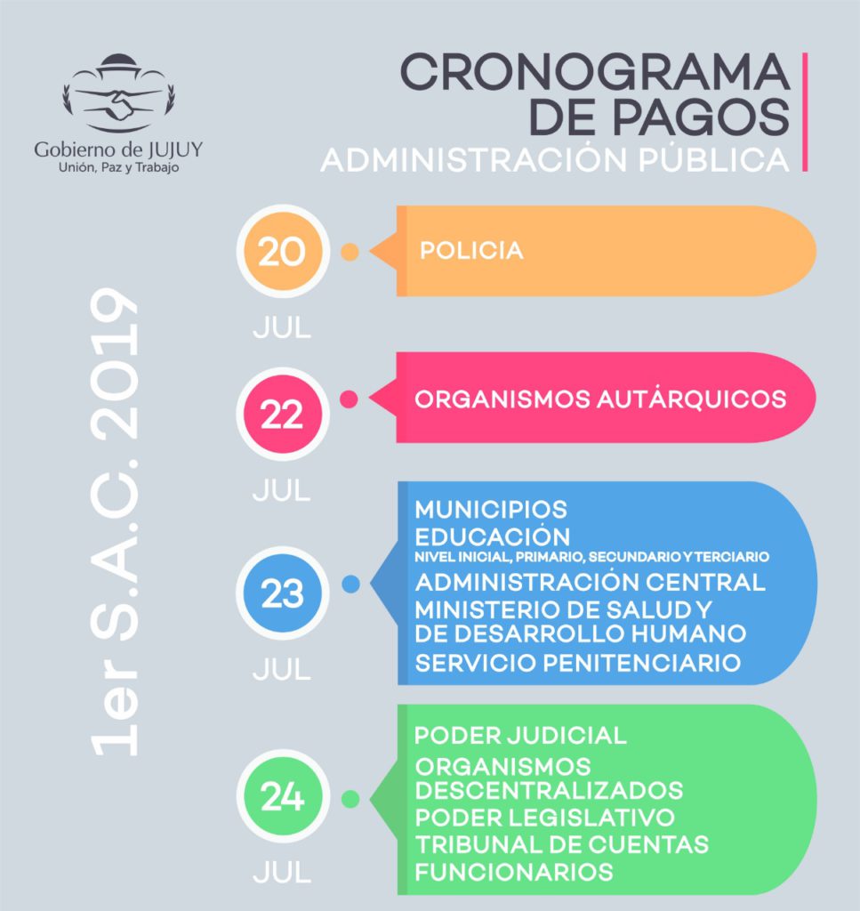Asimismo, el martes 23 de julio, cobrarán sus haberes complementarios, Municipios; Educación Nivel Inicial, Primario, Secundario y Terciario; Administración Central; Ministerios de Salud y Desarrollo Humano y Servicio Penitenciario.