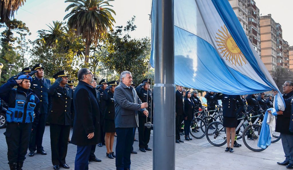 El gobernador de la provincia, Gerardo Morales, encabezó la ceremonia de izamiento de la Bandera Oficial de la Nación y Bandera Nacional de la Libertad Civil, en los mástiles ubicados en la explanada de acceso a Casa de Gobierno, en el marco de recordación de la semana de creación de la Policía de la Provincia de Jujuy, en su 174 Aniversario.
